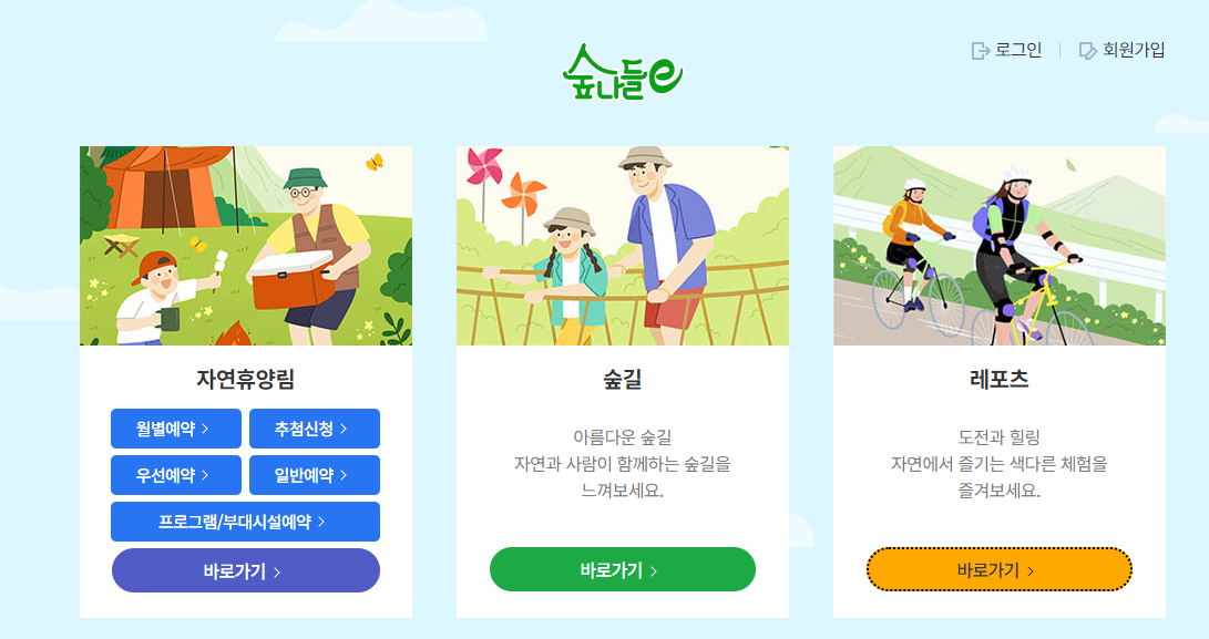- 자연 휴양림 : 전국에 있는 모둔 자연휴양림의 월별예약, 우선 예약, 일반예약이 가능합니다 .