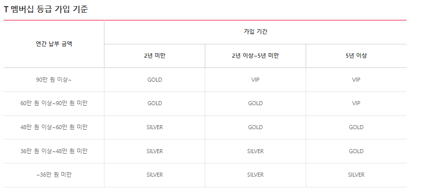 SKTS는 장기고객에 대한 우대가 많습니다. 그중에서 가입기간 30년 이상 고객은 누적 납부 금액과 상관 없이 무조건 VIP 등급이 됩니다. 단, 멤버십 등급 산정 기간 동안 1만원 이상의 요금을 3회 이상 연체하실 경우, GOLD 등급으로 조정되니 주의하셔야합니다 . 가족간 명의변경을 하시면 VIP 등급은 유지되지 않고, 이 경우 T 멤버십 등급 체계에 따라 등급이 바뀌게 되니 주의하셔야 합니다